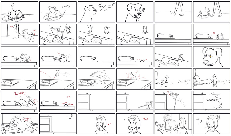 For the story I brainstormed what Barney could do in this scenario to get the sausage. I've decided to let him behave a bit more human but keep his physical boundries as a dog for a comedic and entertaining experience. The result keeps you wondering what he will try next and sometimes it's not what you would expect.